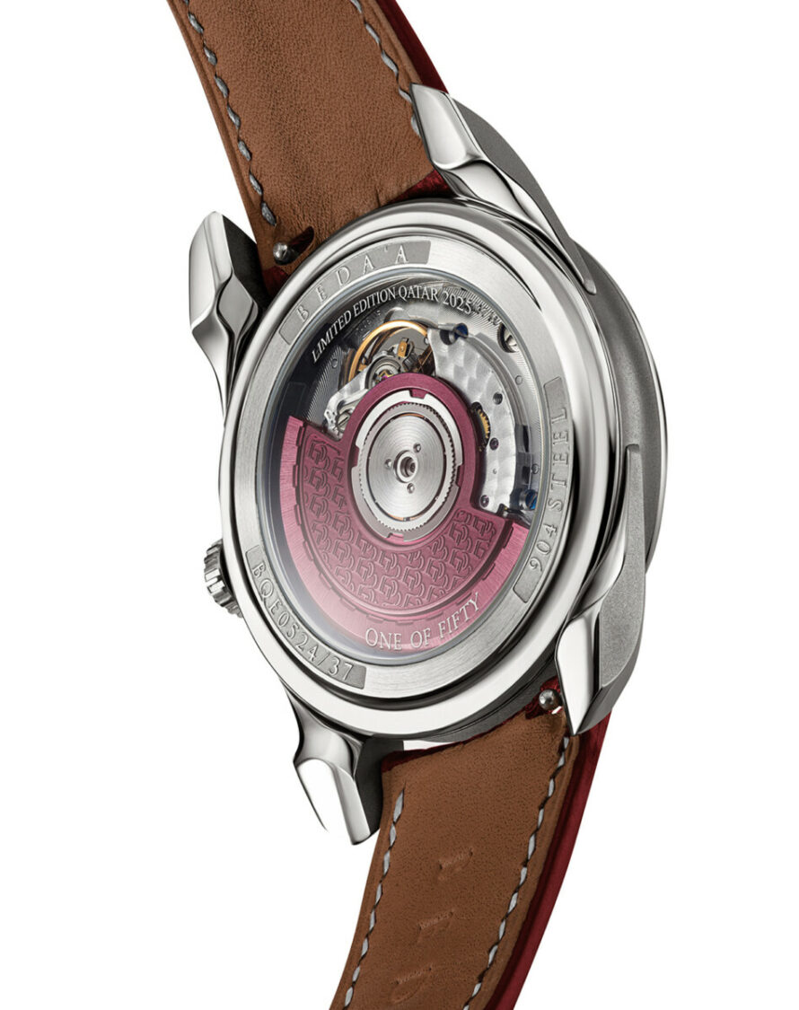 What changes with this edition is the context. The color Ad’am defines the watch. This deep maroon tone, closely associated with the Qatari flag, carries historical and cultural weight that goes far beyond aesthetics. Traditionally, this color was extracted from the sea, from shells, then transformed by time and the desert sun into a darker, richer tone. Over centuries, it became associated with sovereignty, identity, and belonging. That is the color language Beda’a chose to work with here.
