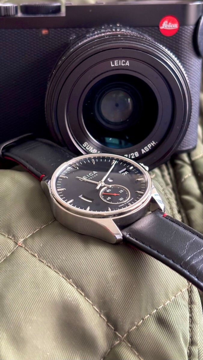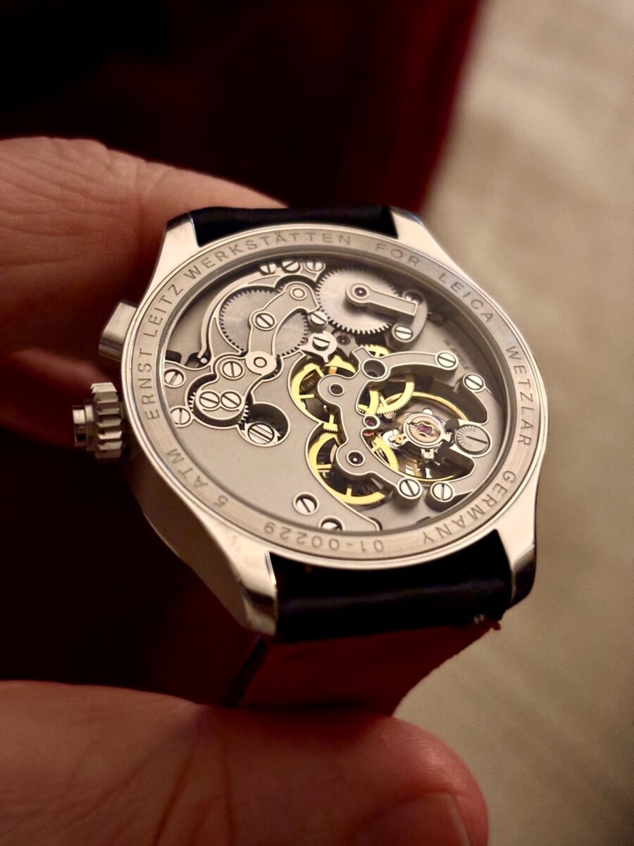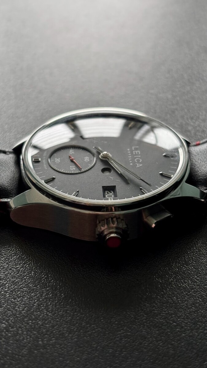 The watch was designed by Prof. Achim Heine, an experienced designer at Leica, as an evolutionary product derived from cameras. Instead of a normal crown, the“Zeitmesser 1” has a kind of shutter release, highlighted in Leica red, of course. A satisfying click of a button orchestrates the inside of the watch in a fraction of a second: it stops the movement, immediately resets the second hand to zero, and marks this with a red dot in the status display. Pressing the button again instantly starts the watch and causes the status display to jump to white.